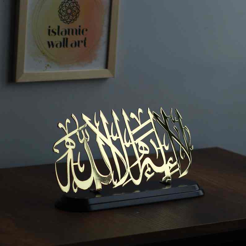 Reflect the core of your faith with the La ilahe illallah Shiny Metal Islamic Table Decor, an exquisite symbol of Islamic calligraphy.
